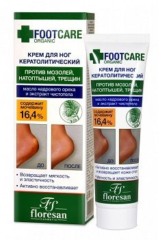 Флоресан Organic FOOT CARE КРЕМ для ног КЕРАТОЛИТИЧЕСКИЙ пр.трещин, натоптышей, огрубевшей кожи Кератолитический крем для ног с экстрактом чистотела и маслом кедрового ореха - эффективное средство для борьбы с натоптышами, трещинами, сухими мозолями и огрубевшими участками кожи стоп. Высокое содержание мочевины (16,4 %) способствует разрыхлению огрубевшей кожи и бережному удалению омертвевших клеток, не затрагивая здоровую кожу. Активный растительный комплекс с натуральными маслами и экстрактами возвращает коже стоп мягкость и эластичность.Результат – Ваши пяточки, как у младенца!