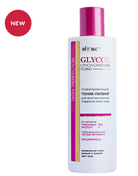 ВИТЭКС GLYCOL Тоник-Пилинг Отшелушивающий для восстановления гладкости кожи лица pro-активная ГЛИКОЛЕВАЯ КИСЛОТА 7% стабилизированный ЧИСТЫЙ ВИТАМИН С и НИАЦИНАМИД (витамин В3) Показания к применению:*Тусклый, неровный цвет лица *Кожа с признаками увядания *Пигментация, постакне *Черные точки, расширенные поры ОБНОВЛЕНИЕ * ОСВЕТЛЕНИЕ * УПРУГОСТЬ Гликолевый тоник-бустер с богатым составом активных компонентов мягко отшелушивает ороговевшие клетки, восстанавливая гладкость и шелковистость кожи, увлажняет и повышает тонус. При регулярном применении цвет лица становится более свежим и ярким. Ультраэффективная комбинация активных компонентов PRO-активная ГЛИКОЛЕВАЯ КИСЛОТА и ЭНЗИМЫ ПАПАЙИ мягко, но эффективно отшелушивают, обновляют и полируют кожу, осветляют пигментацию, помогают восстановить гладкость и нежность.Стабилизированный ЧИСТЫЙ ВИТАМИН С устраняет тусклость кожи, выравнивает тон, обеспечивает антиоксидантное действие. НИАЦИНАМИД и натуральный гель алоэ глубоко увлажняют кожу, улучшают ее упругость, разглаживают и освежают. среднекислый рН 4.5-5.0