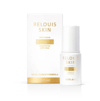 RELOUIS SKIN ANTI-AGE сыворотка для лица COLLAGEN CARE 100 % ФРАНЦУЗСКАЯ ФОРМУЛА РАЗГЛАЖИВАЕТ МОРЩИНЫ ПОВЫШАЕТ ГЛАДКОСТЬ И УПРУГОСТЬ ПРИДАЕТ СИЯЮЩИЙ ТОН ДЛЯ ВСЕХ ТИПОВ КОЖИ, ОСОБЕННО ДЛЯ СУХОЙ И ЗРЕЛОЙ Сыворотка для лица с натуральным коллагеном морского происхождения для эффективного антивозрастного ухода за кожей, особенно сухой, зрелой, подверженной негативному воздействию окружающей среды. Способствует разглаживанию морщин, повышению гладкости и упругости кожи, придает сияющий тон лицу. Коллаген морского происхождения визуально выравнивает рельеф кожи, предотвращает трансэпидермальную потерю влаги, обладает регенерирующими и защитными свойствами.По результатам исследований POLE COSM?TIQUE (Франция)*: — 96 % испытуемых говорят, что кожа стала более гладкой — 93 % считают, что кожа стала более упругой — 96 % отмечают, что морщинки стали менее заметными и разгладились — 93 % заявляют, что тон кожи стал более сияющим *исследования проведены на 28 женщинах после 21 дня регулярного применения.