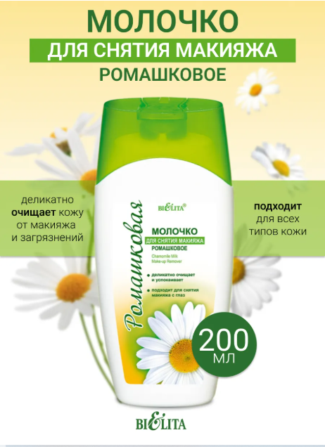 БЕЛИТА ЛИНИЯ КОСМЕТИКА РОМАШКОВАЯ молочко для снятия макияжа деликатно очищает кожу от макияжа и загрязнений. экстракт ромашки и аллантоин, входящие в состав молочка, успокаивают и увлажняют кожу, оказывают освежающее действие. масло сезама (кунжута) питает, восстанавливает барьерные функции кожи. Подходит для всех типов кожи, даже для сухой и чувствительной.